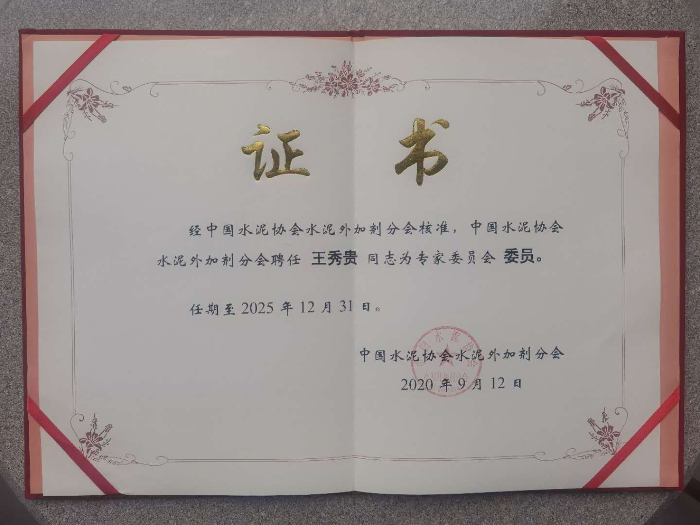 2020年9月經(jīng)中國水泥協(xié)會(huì )外加劑分會(huì )核準,中國水泥協(xié)會(huì )水泥外加劑分會(huì )聘任長(cháng)沙保靈建材助劑有限公司董事長(cháng)王秀貴先生為專(zhuān)家委員會(huì )委員。